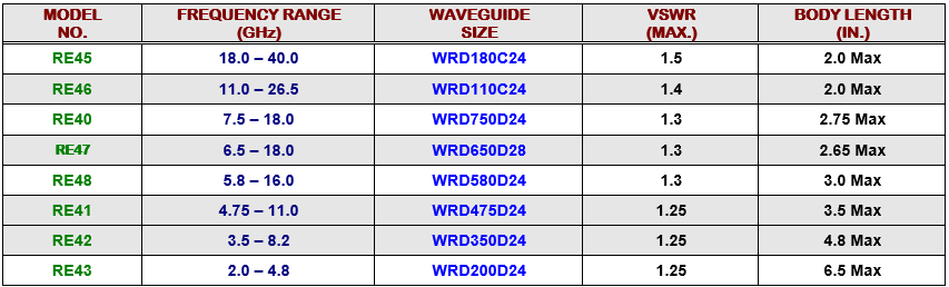 - EXAMPLE: Model number RE43-SC-P is a WRD-200D24 double-ridge waveguide to SC female coaxial connector rated at 800 W average power.